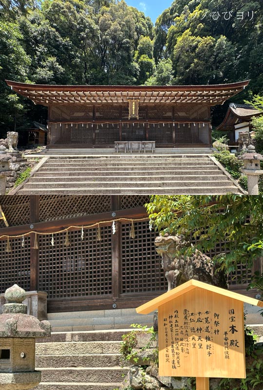 「本殿」は「国宝・重要文化財」で年輪年代測定調査の結果、一〇六〇年頃の建造で「最古の神社建築(現存)」とされている。また、ユネスコの世界遺産に「古都京都の文化財」の構成資産として登録されている。「宇治神社」より、約二〇〇m、徒歩三分と近い。