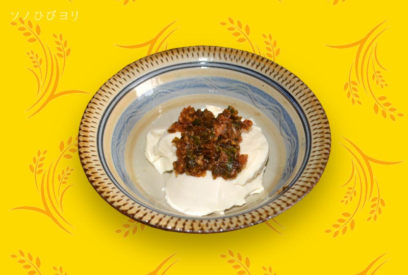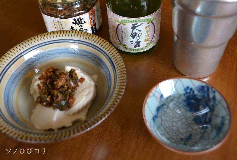 合わす肴は酒蔵「西條合資会社」さんで買ったお土産の「酒かす入り焼きねぎ味噌」。 このまま舐めて肴にしても旨いのですが、記事にするには絵面が悪いので(笑)・・・そこで「おぼろ豆腐」に添えることにしました。