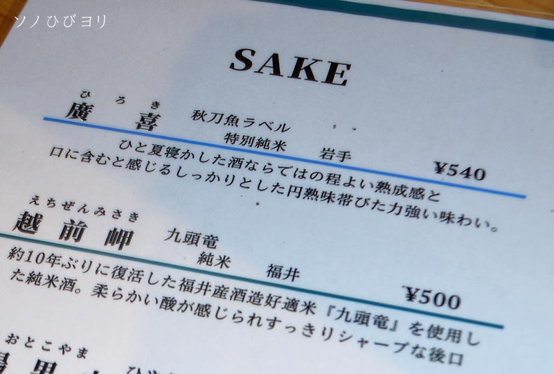 今宵も前々回に引き続き「No.5」さんで一献です。本日いただくお酒は、岩手県紫波郡にある小さな酒蔵「紫波酒造店」さんの秋限定酒「廣喜 特別純米 秋酒 秋刀魚ラベル」です。