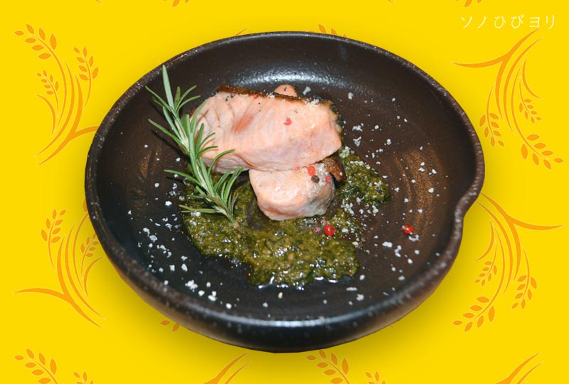 秋限定酒のお酒に合わした肴は「秋鮭のグリル・ジェノベーゼソース」! さすがはミシュラン認定レストランを経験したシェフです、おしゃれ感満載の肴です~。秋鮭の焼き具合は皮めがパリッと、表面の身の部分は程よい食感があり、中はほのかに暖かいレアーになっている。そして香り高き「ジェノベーゼソース」、このソースは日本酒の邪魔になるかと思ったが、合うのですよ意外に!