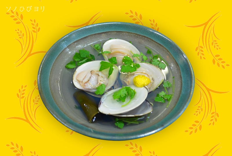 ひな祭りや結婚式などのお祝いの席で食べられる縁起物の「はまぐり」。その貝殻のサイズがなんと約7センチ~(さすがはこだわり屋の大将です・笑)! 大粒の「はまぐり」が、昆布出しの効いたツユにドボ~んと浸かり、アクセントに「三つ葉」をパラパラ、なんて美しい今宵の肴!
