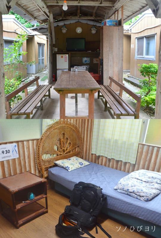 きた道を戻り中森に続く坂の途中に「ペンション・マイトウゼ」のバンガローが建っています。母家からは徒歩3分の距離。今日の泊まりは私だけらしい、静かなバンガローは昔のままでなぜか安心する。荷を解きベットに転がったが、潮水でベタついた体が気持ち悪い・・・。誰も居ないからパンイチでシャワー室に向かい、さっぱりとした気持ちで夕食までの時間を島内一周に出かけることにした。ここでは、それくらいしか時間を潰す方法はないのです(笑)。