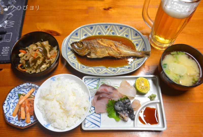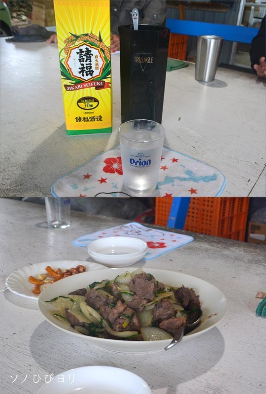 晩御飯の献立は地魚の煮付けにお刺身、切り干し大根と昆布の炊き合わせ、お漬物と味噌汁、もちろん「オリ生」も~! 本当に優しく美味しい晩御飯をいただいた。追加の晩酌には「鳩間島音楽祭ラベル」小瓶の島酒で波の音を聞きながら静かな時間を過ごした。
