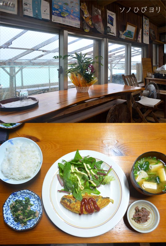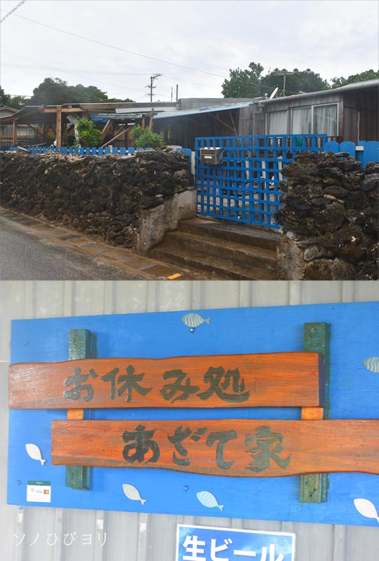 その「ある場所」とは、母家まで行くメイン通りの手前の青い家「あざて屋」さん。朝食のため母屋に行くには、その前を通らなければならない。とにかく注意深く、恐る恐る、家屋前のテラス席に人が居ないか確認して慎重に通過する。(なぜ、恐る恐るなのか、それはこの島では早朝から普通に呑んでいるからなのです。朝から捕まれば大変なことになる・苦笑)