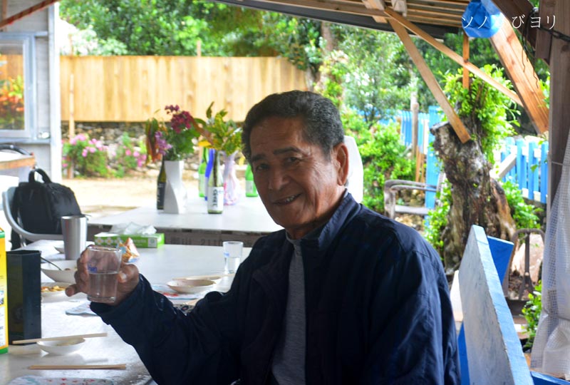 話し声は聞かずとも耳に入ってくる、その声を聞いているうちに、どこかで聞いたことのある!?。・・・あっ!この人は、酒の島の化身の一人「比嘉盛雄さん」だ! まずい! そう思った瞬間に盛雄さんが、こちらを振り返り一瞥。ほっとするのも束の間、『あっ!』と呟き、再度、振り向いて『これはこれは失礼しました』と。あ~あっ、見つかってしまった・・・。この盛雄さんとは不思議な縁で繋がっていて、仕事は大工さん(棟梁)で石垣在住、なのに私の過去の八重山旅で必ずどこかで遭遇するのです。