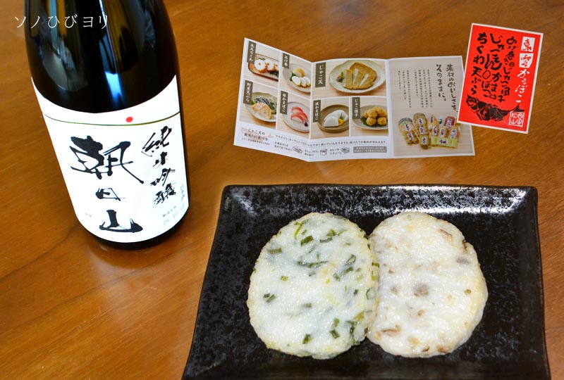 酒の肴としてもスッキリ爽やかな「朝日山 純米吟醸」の邪魔をしない、上品な味の「天ぷら」なのです。それもそのはず、「東雲かまぼこ」さんのこだわりが凄い! 宇和海や瀬戸内海など近場でとれた新鮮な魚だけを使用して、防腐剤・化学調味料・合成着色料などは一切使わず、揚げる油は「なたねサラダ油」に天然岩塩。それは旨いはずですよ~! これ簡単お手軽、究極の酒の肴ですね。