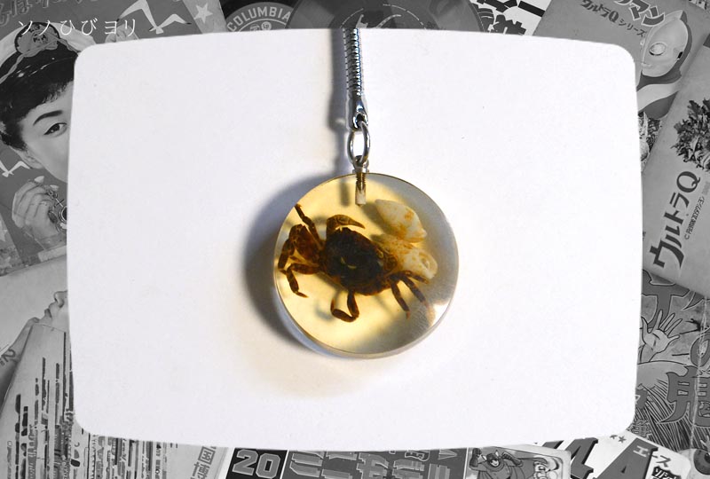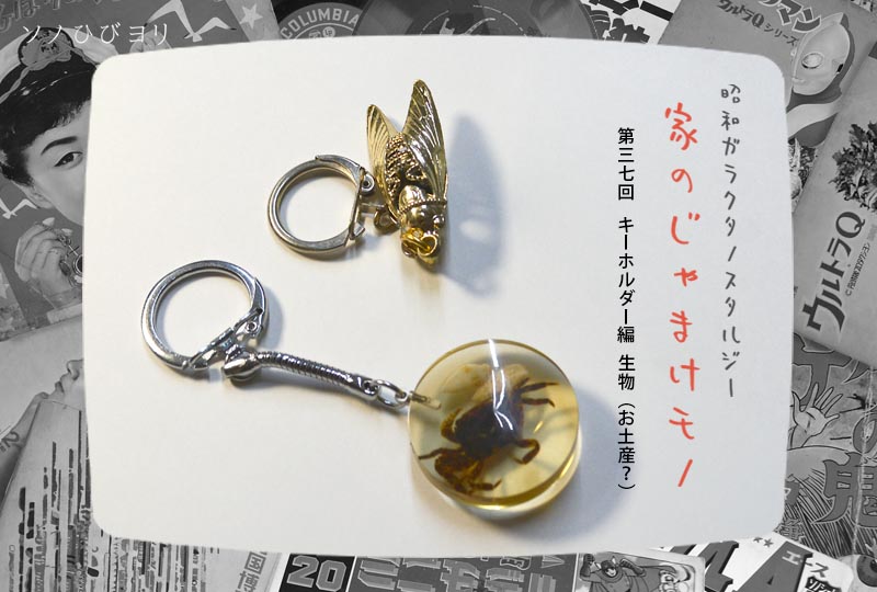 そして、もうひとつ、樹脂に固められたカニのキーホルダーだ。これも、どこのお土産か?分からない。水族館または海辺の観光地だろうと思うけど・・・。キーホルダーにされているカニは、なんの変哲もない海辺のカニ。子供だったら、こんなカニ、磯遊びでいくらでも摂っている! そんな物をお土産にくれた、昭和の大人たちのドタマの中を覗いてみたい~。せめて、地名は入れといてよ。