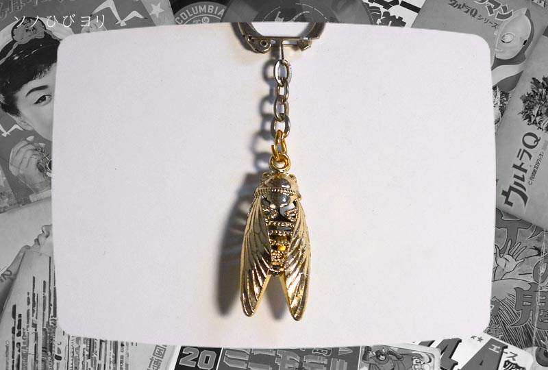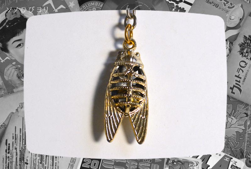 ひとつはお腹の部分に鈴が入っている「金色のセミ」? このキーホルダーの雰囲気を見ていると、セミに由来がある神社仏閣のお土産だと推測。ネットで調べてみたけど分からない・・・。セミ関係では唯一「セミの幼虫ヌケガラ」が、受験に落ちない験担ぎらしい。もちろん、このキーホルダーは成虫なので関係ない、せめて「ミ~ンミ~ン」とでも鳴れば良いんだけど。