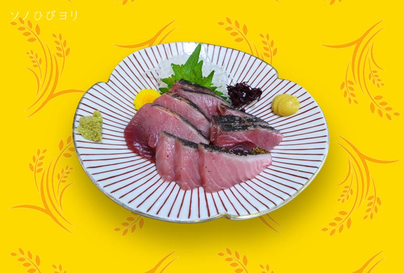 山口・萩の美人なお酒に合わす肴は、山口県でも水揚げされている高級魚「シビ(コシナガ)マグロ」のお刺身(皮目炙り)をいただきます。この「シビ(コシナガ)マグロ」は1メートル未満の小型マグロで、適度な脂が乗っていて上品な旨味があるマグロです。特に赤身部分が美味しく、モチモチ食感が良いのです。